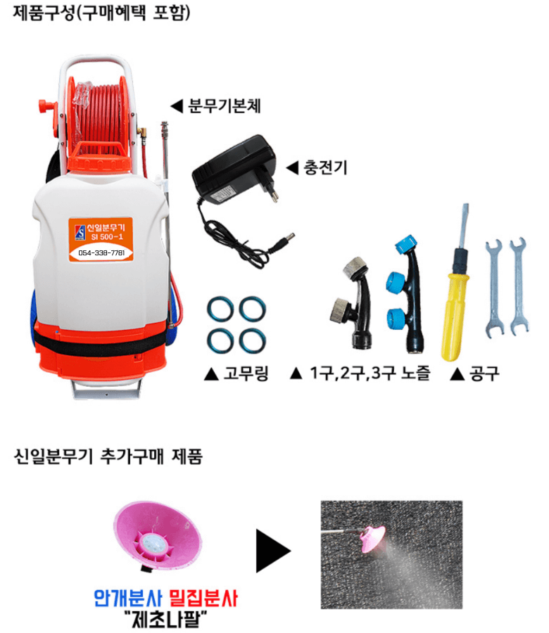 저희 신일 밀차형 충전식 분무기의 구성용품은 분무기 본체, 밀차형 수레, 충전기와 고무패킹 그리고 1구, 2구, 3구의 다양한 노즐로 구성되어 있으며 추가구매 상품으로는 안개분사가 가능한 제초 나팔이 있습니다.