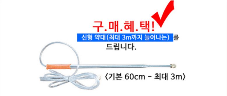 저희 신일종합농기계에서 신일 밀차형 분무기를 구매하신다면 기본 60cm ~ 최대 3m까지 늘어나는 신형 약대를 서비스로 증정하고 있습니다.