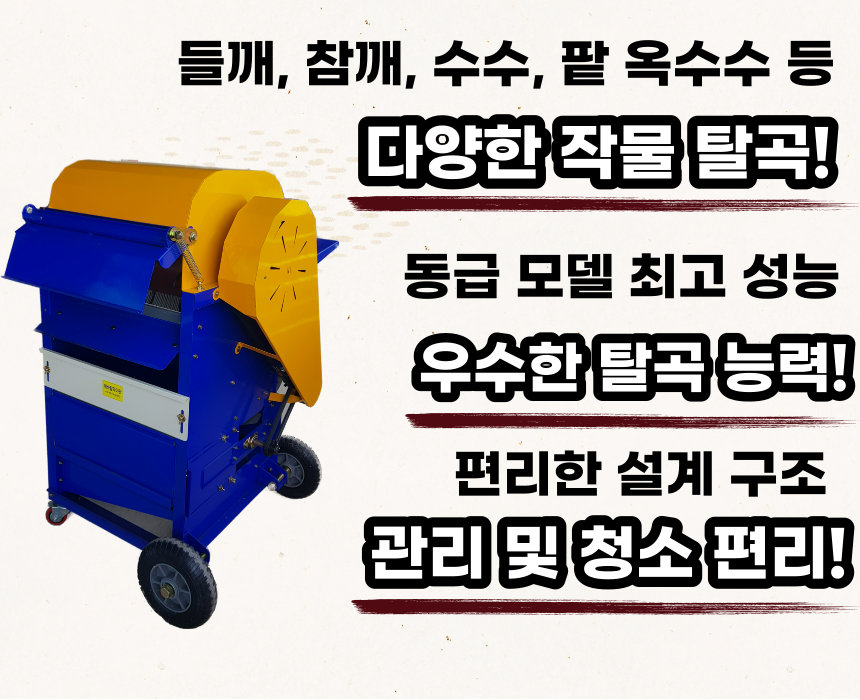 시중에 판매되는 탈곡기 중 최고 성능과 우수한 탈곡 능력을 가지고 있으며 심플한 설계와 디자인으로 탈곡기 관리 및 청소가 간편한 장점이 있습니다.