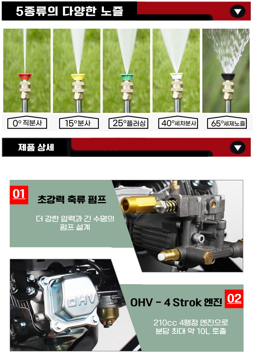 저희 고압세척기를 구매하시면 기본적으로 5종류의 다양한 노즐을 제공하고 있으며 노즐의 각도에 따라 직분사에서부터 강력하면서도 부드러운 세차분사까지 다양하게 사용할 수 있으며 세차는 물론 전원주택에서의 마당 청소, 데크 청소 등에도 사용 할 수 있습니다. (실제로 저희 공장 바닥의 물청소 밑 데크 청소에도 유용하게 사용하고 있습니다^^)