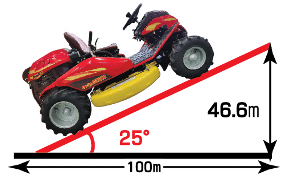 승용예초기를 사용할 때 최대 25도 각도의 경사로에서도 작업이 가능하며, 4륜 구동이기 때문에 웅덩이나 진흙밭에 한쪽 바퀴가 빠지더라도 충분히 빠져나올 수 있는 힘이 있습니다.